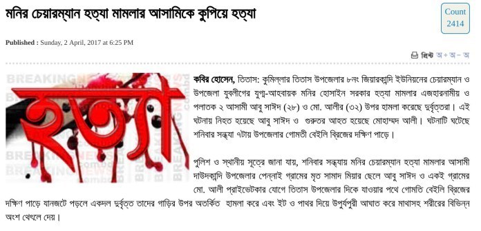 Another Bangladeshi news portal Jagonews24.com talks about the incident in a March 2018 article about political murders in Titas. The report says that Sarkar was shot dead on November 8, 2016, in Gouripur Bazar. Six months later, his supporters sought revenge for the murder and hacked to death Abu Syed and Md Ali.