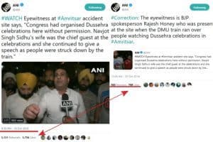 In a tragic accident, a train mowed down Dussehra revellers gathered close to the tracks near Amritsar. At least 60 people are feared dead. Soon after, videos of the disaster shot by several eyewitnesses were picked up by news organisations, including Asian News International (ANI). Subsequently, ANI also put out an eyewitness’ statement that blamed the Congress for the incident. This tweet was posted at 8:39 PM on October 19.