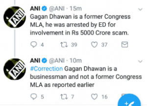 In 2017, ANI tweeted that Gangan Dhawan, a former Congress MLA was arrested by the ED for involvement in a Rs 5,000 crore scam. The news agency later deleted this tweet and put out a clarification saying that Dhawan is a businessman and not a former MLA of the INC.