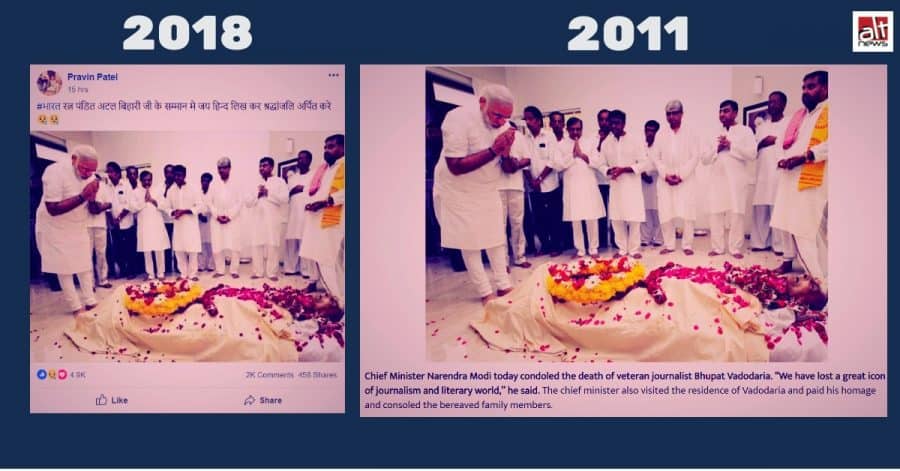 A Facebook Page “जय मोदीराज” shared an image of PM Narendra Modi supposedly paying homage to the mortal remains of Vajpayee.