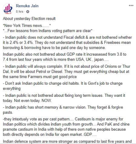 After the results of the assembly elections in five states were announced on December 11, a message began circulating on multiple social media platforms and WhatsApp. It was claimed to be the observation of an ‘author’ of The New York Times, the popular American newspaper. The message sought to build a wave of sympathy for Prime Minister Narendra Modi and the Bharatiya Janata Party, and denigrated Indian citizens for having a “short memory and narrow vision”, for failing to recognize the need to “fix long term issues” which PM Modi is successfully doing.