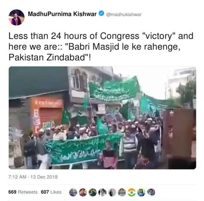 Madhu Kishwar and Tarek Fatah had tweeted another video in which they had made a similar claim- of Pakistani flags waved at Congress’ victory rally.