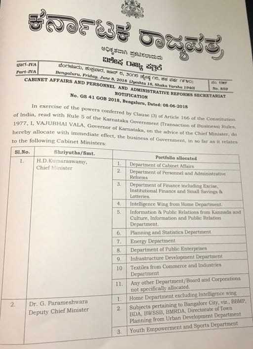 Kumaraswamy kept 11 portfolios, while Deputy Chief Minister G Parameshwar got Home Ministry, Bangalore city and Youth empowerment.