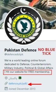 3. The bio also includes a website – “defence.pk/pdf/”This website lists @defencedotpk as its official Twitter handle. However, defence.pk is not the official website of Pakistan’s Ministry of Defence and was started as a forum to discuss issues pertaining to the Pakistani army. Any Pakistani government website ends with “gov.pk” and the URL of the official website of the defence ministry is mod.gov.pk