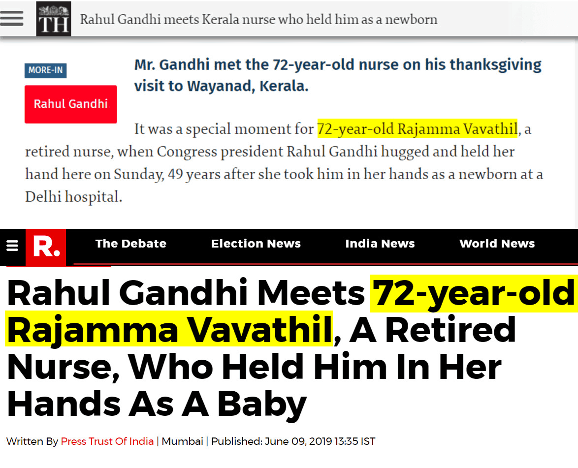 Alt News contacted Rajamma Vavathil to confirm her age during the time when Rahul Gandhi was born. She said, “I was 23 when Rahul Gandhi was born. I am a 72-year-old lady now. It has been 48 years since he was born. The relationship between me and Rahul Gandhi is that he was born in front of me and I call him beta [son]. My date of birth is June 1, 1947. He was born on June 19, 1970. You calculate. I don’t want to be insulted like this. I am not into politics.” Thus, the claim that Rajamma was only 13 years old when Rahul Gandhi was born is factually incorrect.