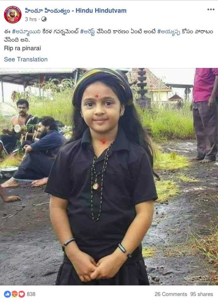 The above photograph has circulated on social media with the narrative that this little girl was arrested by the Kerala goverment. A Facebook page, హిందూ హిందుత్వం – Hindu Hindutvam has shared the photo with the aforementioned text. The message suggested that this young girl was ‘fighting’ against the Supreme court judgement allowing entry of women of menstruating age in the Sabarimala temple.
