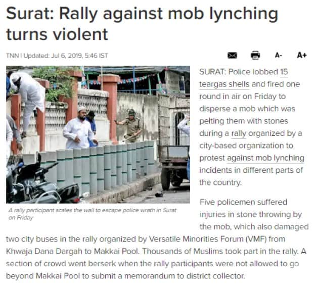 TV9 Gujarati also reported the incident. A rally to protest mob lynchings was taken out in Surat on July 5. The agitation, however, turned violence and mob began pelting stones. The Times of India reported, “A section of [the] crowd went berserk when the rally participants were not allowed to go beyond Makkai Pool to submit a memorandum to [the] district collector. According to the report, two buses were attacked. “The mob targeted a city bus near Take Off restaurant and broke its window panes and the other at another place,” it said.