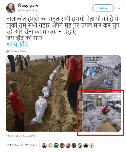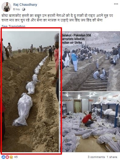 A set of images doing rounds on social media is being shared with claims that it depicts the impact of Indian Air Force’s airstrike in Pakistan. The photographs show mass graves and shrouded dead bodies. “बालाकोट हमले का सबूत सभी हरामी नेताओं को है ये ताकी तुम सभी ग़द्दार अपने मुह पर चपल मार कर चुप रहे और सेना का माजक न उड़ाऐ |जय हिंद की सेना! (This proof of Balakot attack is for the ha**** ministers so that you traitors hit your faces with slippers and keep your mouths shut instead of making fun of our forces.),” is the commonly used caption accompanying the photographs. Another caption that is being used to share the images is – “यह है सबूत अच्छी तरह से चशमा लगा कर देख लिजियेगा जी। (This is the proof. See properly with spectacles on.)