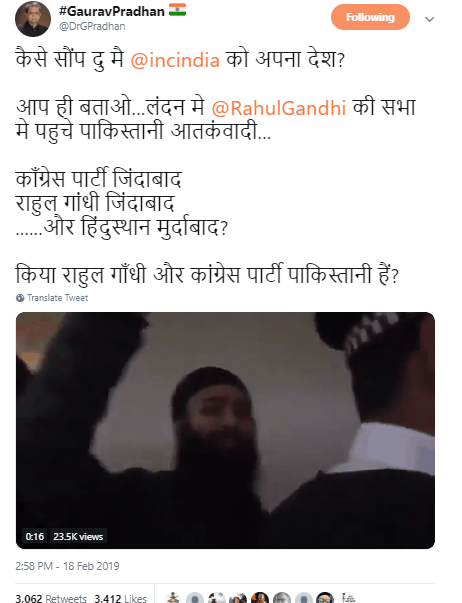 Recently, a video is being circulated on social media with the claim that the Congress let in Khalistan protesters at their event where the separatists chanted anti-India slogans. Several individual users have shared the clip, including Gaurav Pradhan who has often been found sharing misleading postsfrom his social media accounts. He circulated the clip where Khalistan supporters can be heard allegedly saying, “Congress Zindabad, Hindustan Murdabad”. Pradhan questions if Rahul Gandhi and Congress are “Pakistanis”.