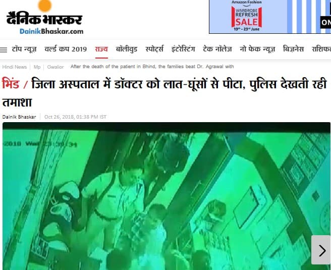A keyword search with time filter on Facebook led us to an October 31, 2018 report in medicalreportertoday.com. According to the report, the incident took place in the district hospital of Bhind in Madhya Pradesh. The family members of a deceased patient thrashed the on-duty doctor inside his chamber. The report by medicalreportertoday.com also carried the same video uploaded last year.