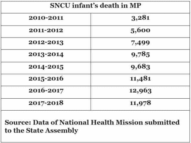As per the National Health Mission data submitted to the Madhya Pradesh Assembly, as many as 72,000 infants died in Special Newborn Care Units (SNCUs) of government hospitals across the state between 2009 and 2017.