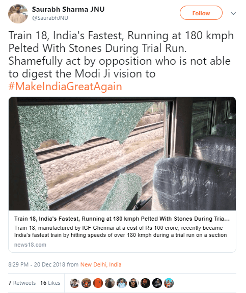 Train 18, dubbed as the country’s fastest train, was attacked with stones after departing Safdarjung on December 20 at 12:30 pm. The incident was widely reported on mainstream media. According to The Times of India, ‘unknown miscreants’ pelted stones at Train 18, breaking a windowpane.