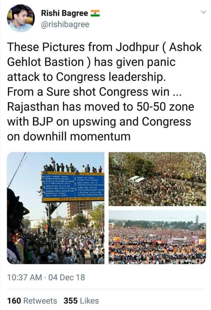 “These Pictures from Jodhpur ( Ashok Gehlot Bastion ) has given panic attack to Congress leadership.” tweeted Rishi Bagree, who is followed by PM Modi, on December 4, 2018 along with a set of images. He claimed that the crowd surge at PM Modi’s election rally in Jodhpur is illustrative of the neck and neck contest between the Congress party and BJP in the state. The tweet has now been deleted.
