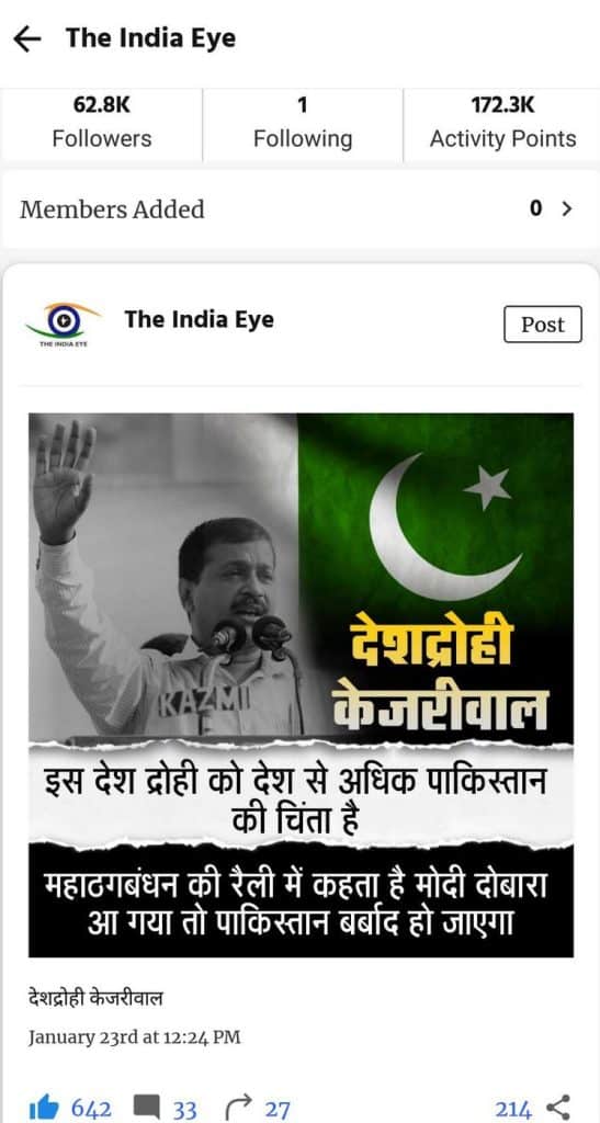 In the aftermath of the opposition’s Mahagathbandhan rally, this account attempted to portray Delhi chief minister Arvind Kejriwal as more concerned about Pakistan than about India. “Pakistan will suffer if Modi comes into power” – this quote was ascribed to CM Kejriwal while The India Eye termed him “anti-national”. The post appeared in Hindi and its text read – “इस देश द्रोही को देश से अधिक पाकिस्तान की चिंता है महागठबंधन की रैली में कहता है मोदी दोबारा आ गया तो पाकिस्तान बर्बाद हो जायेगा|”