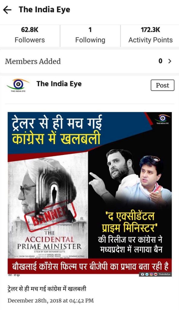 Another post by The India Eye said, “Congress bans the release of The Accidental Prime Minister in Madhya Pradesh”.