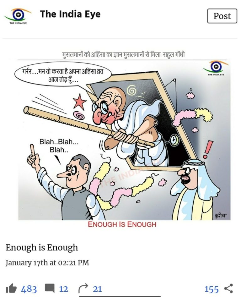 A cartoon posted by The India Eye attributed a statement to Rahul Gandhi which said, “मुसलमानो को अहिंसा का ज्ञान मुसलमानो से मिला (Muslims got the philosophy of non-violence from Muslims/Islam-translated)”.