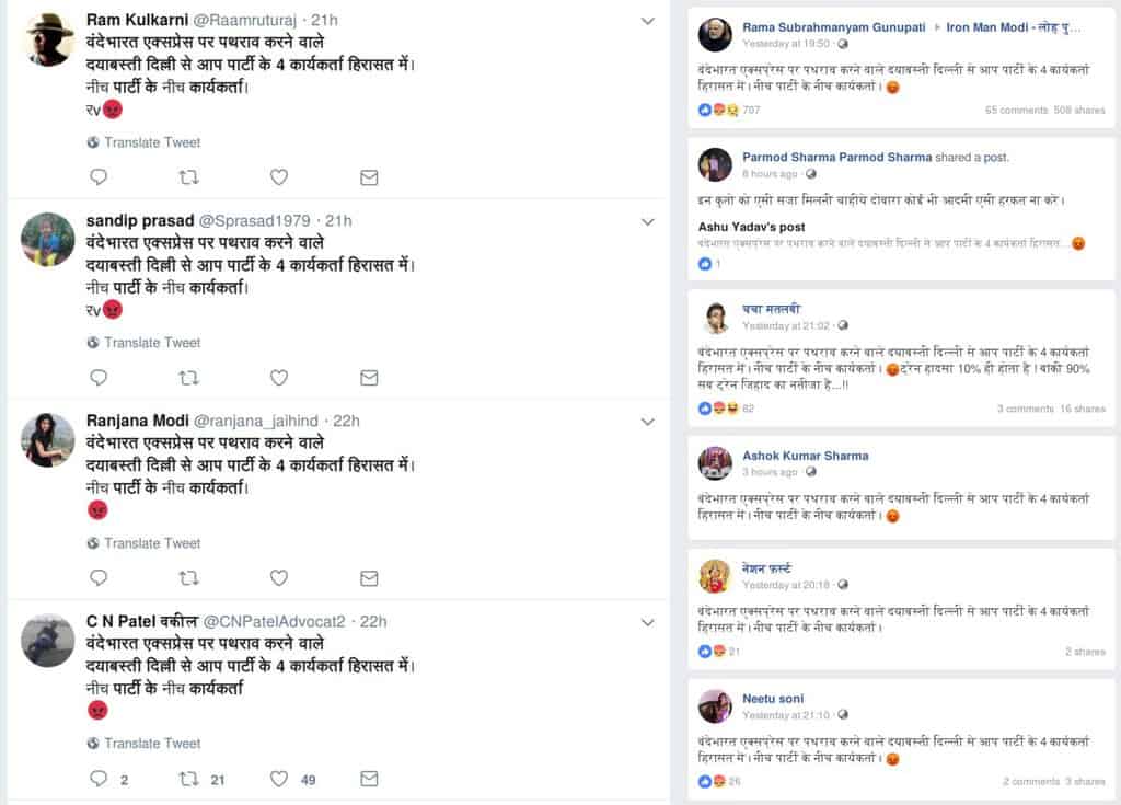 Alt News found that the claim about the four people, who were allegedly arrested for stone pelting at Vande Bharat Express being AAP supporters is false and malicious. According to media reports, the police has made no arrest in the case so far. An article published by NDTV on February 2, said, “No one was hurt and no arrests were made after the incident occurred when the train left Sakurbasti at around 11:03 pm on Friday to reach New Delhi to begin its trial run to Allahabad, railways said.” Railway Police Force personnel who were escorting the train to New Delhi station had informed the authorities about the stone pelting incident on reaching the station. Initial reports indeed suggested that the attack took place near Daya Basti.