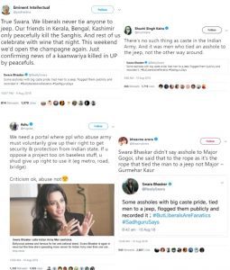 Her tweet on “ass***** tied men to jeep” was not related to Major Gogoi or the Indian army but the 2016 Una flogging where seven members of a Dalit family were tied to a jeep and beaten with iron rods for skinning a dead cow. The actress clarified the same on Twitter after her post was completely misinterpreted.