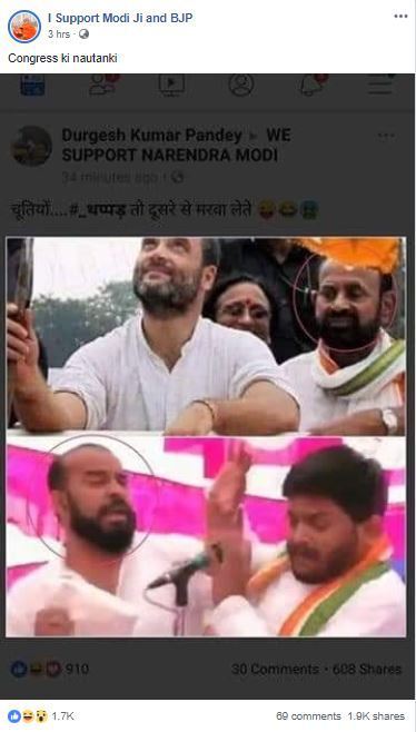 Hardik Patel, who is a Patidar leader from Gujarat and joined Congress earlier this year, was reportedly slapped by one Tarun Gajjar at a rally in Surendranagar, Gujarat. Soon after the incident, a Facebook page, I Support Modi ji and BJP, shared a collage of two pictures featuring Congress president Rahul Gandhi and Hardik Patel. In the image placed at the top, Gandhi is flanked by an unidentified person, while in the bottom image, a picture of the incident where Patel was slapped at a rally has been placed. It is being claimed that the man who attacked Patel was also seen with Rahul Gandhi at some other event in the past. It implicitly suggests that the accused in this incident is a Congressman and ergo, it’s a “Congress gimmick”.