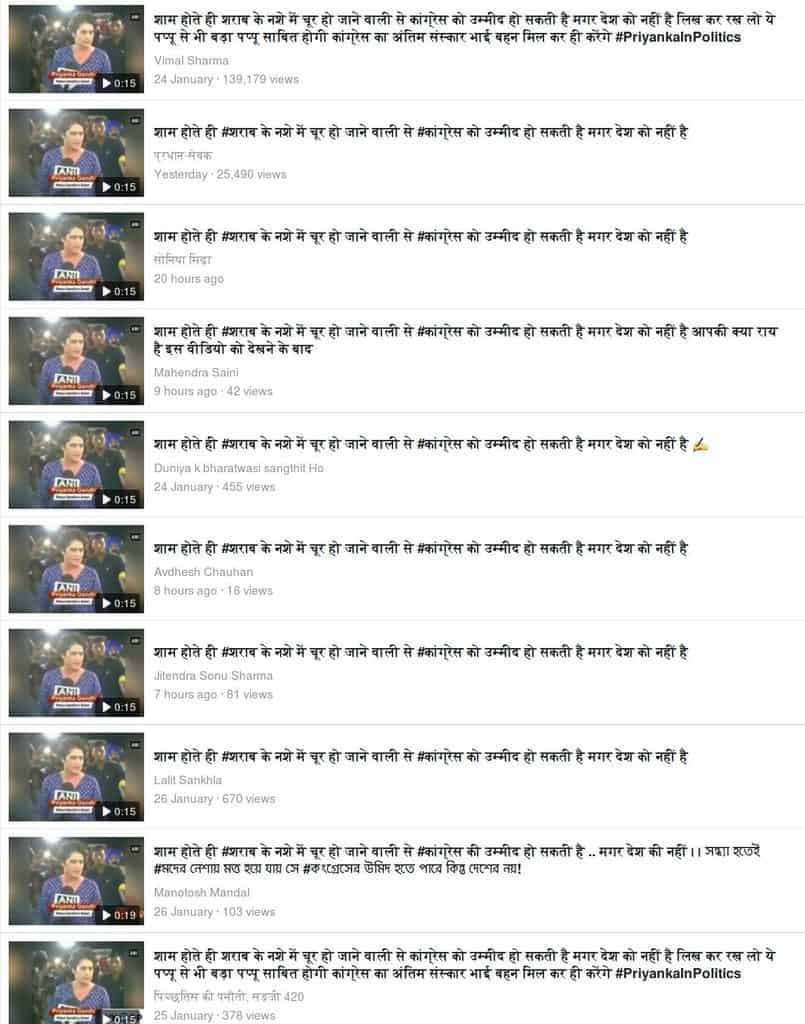 “शाम होते ही #शराब के नशे में चूर हो जाने वाली से #कांग्रेस को उम्मीद हो सकती है मगर देश को नहीं है (Congress can have their hopes on those who get drunk every evening but the country cannot. -translated)”A video of Priyanka Gandhi speaking angrily with people at what seems like a public gathering has gone viral on social media. The text circulated along with the video suggests that she can’t be trusted as a politician since she is an alcoholic. Humlog, a Facebook page has posted the video with the same text. It has been viewed more than 98,000 times and shared more than 3,900 times so far.