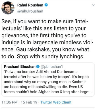 “See, if you want to make sure ‘intellectuals’ like this ass listen to your grievances, the first thing you’ve to indulge is in largescale mindless violence. Gau Rakshaks you know what to do. Stop with sundry lynchings.” Rahul Roushan, CEO of right-wing news portal OpIndia, tweeted this ‘advice’ to gau rakshaks asking them to give up sundry lynchings and instead indulge in large scale violence to get attention. Roushan was reacting to a tweet of lawyer and activist Prashant Bhushan. He seemed upset that Prashant Bhushan had shared a Reuters news story from India Today on Pulwama suicide bomber and commented “It’s imp to understand why so many young men in Kashmir are becoming militants & willing to die.”