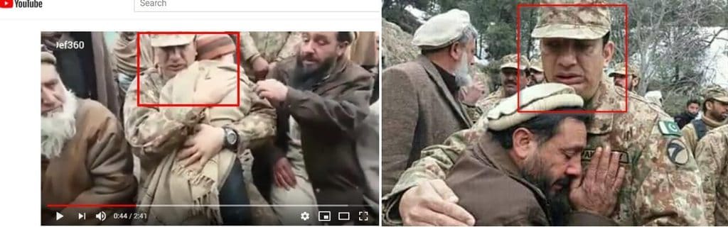 We found that the instant represented in this photograph appeared in the video at about 0:27 seconds. One can evidently spot similarities between the video frame (left) and the photograph (right), Not only are the subjects in both images same, but the name tag on the Pakistan army officer’s uniform reads ‘Faisal’.