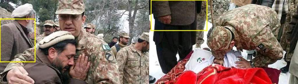 It is, therefore, clear that these photographs pertained to the viral video. The Pakistani army officer Faisal was visible in both places and the photographs espoused the narrative of the audio commentary – that one man, the father of the child, was killed.