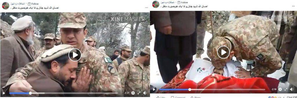 At about 0:50 seconds in the video, an officer of the Pakistani army lifts a child to console him. Simultaneously, an audio commentary from behind the camera, directed at the boy, says – “ये रुतबा अल्लाह के कुछ ख़ास बन्दों को नसीब होता है. आपको पता है की कुछ 200 बन्दे ऊपर गए थे? इसके नसीब में लिखा हुआ था शहादत. हम रोज़ाना चढ़ते है, जाते है, आते है. तो ये अल्लाह के ख़ास बन्दे, जिसपे करम होता है, जिसपे उनकी ख़ास नज़र-ओ-करम होती है, उसको ये नसीब होता है…परेशान नहीं होना तुम्हारा वालिद मरा नहीं है, ज़िंदा है. मरा हुआ नहीं बोलते. (This is a privilege received by only a few men special to God. Did you know some 200 men went up? Martyrdom was in his destiny. We climb every day, we go and come back. So he is special to God, who had God’s mercy, and was destined for this. Don’t get worried, your father is not dead, he is alive. You shouldn’t say he is dead.)”