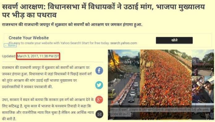 We reverse searched the second image and found a News18 report with the caption, “जयपुर में सवर्ण आरक्षण के लिए करणी सेना के आह्वान पर निकाली गई रैली और धरना-प्रदर्शन की तस्वीरें” (Photos of rally in Jaipur called by Karni Sena demanding reservation for upper castes- translated).
