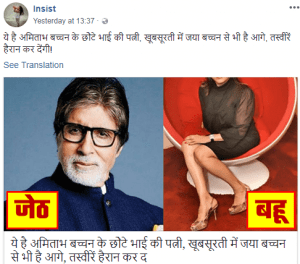 Alt News had earlier reported on the workings of InsistPost.com, run by a young man named Ankit Kumar. Not only does the website regularly share articles on its Facebook page but also other many other partnered pages. A lot of its articles concentrated on the issue of sex, how to increase one’s longevity in bed, why women shut their eyes during sex, and more. Most of the articles shared by its Facebook page has cropped images of women – basically, neck down till their waists and/or their legs. But men’s faces are clearly shown. For instance, this article about “Amitabh Bachchan’s younger brother’s wife” has the actor’s face and the woman’s legs.