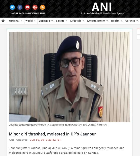 In a reply to a tweet that carried a clip of the molestation, Jaunpur police posted a video statement issued by the City’s Superintendent of Police. Addressing the media, SP VK Mishra said, “A video had gone viral of a minor girl being beaten by a young man in a village that lies under the jurisdiction of Zafarabad police station. In the video, the man was brutally slapping the girl. Police had registered FIR against Chhattu alias Hriday, son of Kailash and Kallu, son of Gomti. The girl was herding goats when the duo arrived on a motorcycle and started harassing her. Both the men have been arrested.”