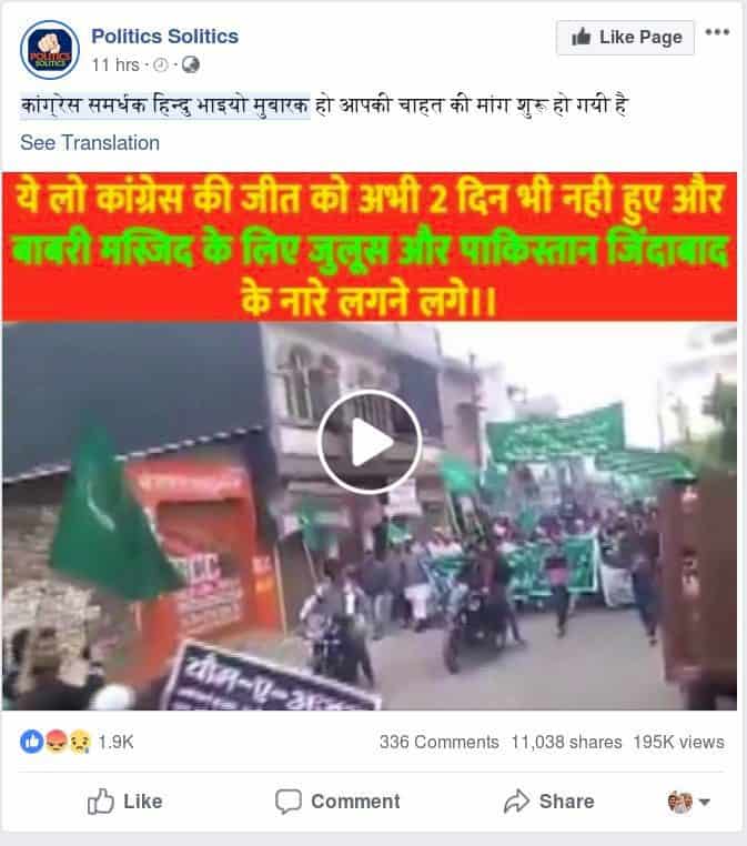 Politics Solitics, a Facebook page has shared the same video with a message, “कांग्रेस समर्धक हिन्दु भाइयो मुबारक हो आपकी चाहत की मांग शुरू हो गयी है (Congratulation to our Congress supporting Hindu brothers, the demands for your wishes have begun -translated)”. So far, this post has garnered close to 11,000 shares and 2 lakh views.