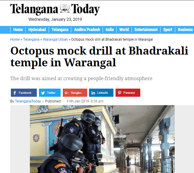 The mock drill was also reported by other mainstream media outlets in the southern states. Telangana Today reported on January 11 – “In order to send a message to the people that the police force is always ready to rescue them in case of any terrorist attack, the personnel of the elite commando force Octopus (Organisation for Counter Terrorist Operations) with the assistance of the local police have conducted a mock drill at the famous Bhadrakali temple.”