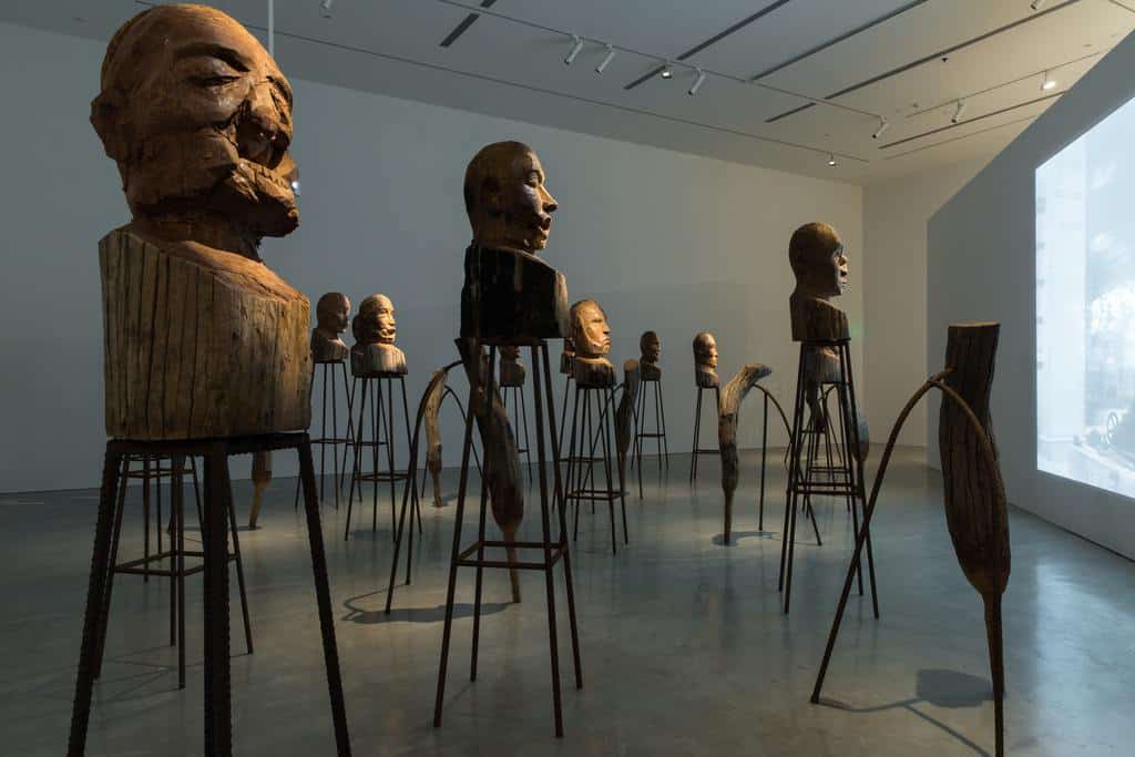 Other key works are Untitled (2016), where the artist has woven red neon into the splitting timber of an ancient wooden sculpture from the Sakalava people of Madagascar. And sharing the gallery with The Culture of Fear is J’Accuse (2016), a series of monumental teak busts and truncated legs that stand opposite a 1938 film montage by the French director Abel Gance.