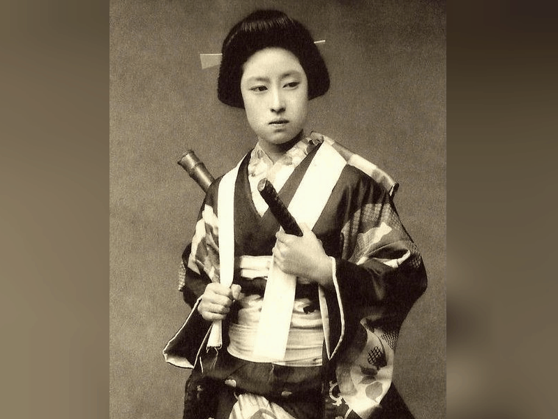 Photo of an actress posing as Nakano Takeko, a famous female warrior and military leader who fought and died during the final years of the Shogunate in Japan. Image from Wikipedia, public domain.