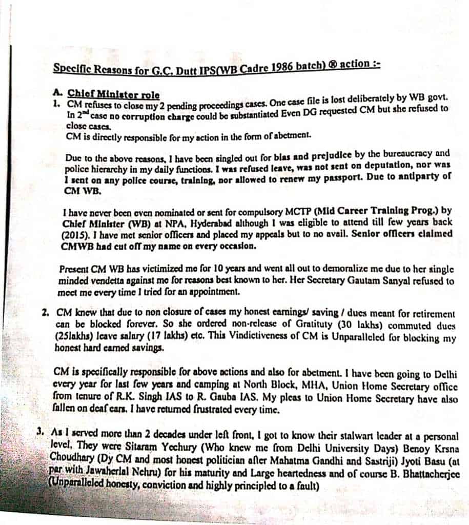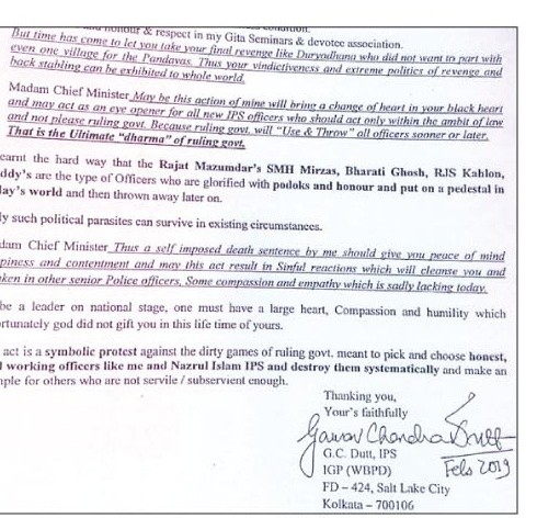 “Madam Chief Minister, maybe this action of mine will bring a change of heart in your black heart and may act as an eye-opener for all new IPS officers who should act only within the ambit of law and not please ruling govt. Because the ruling government will ‘Use and Throw’ all officers sooner or later. This is the ultimate dharma of ruling govt (sic),” Dutt wrote in the letter addressed to Banerjee.