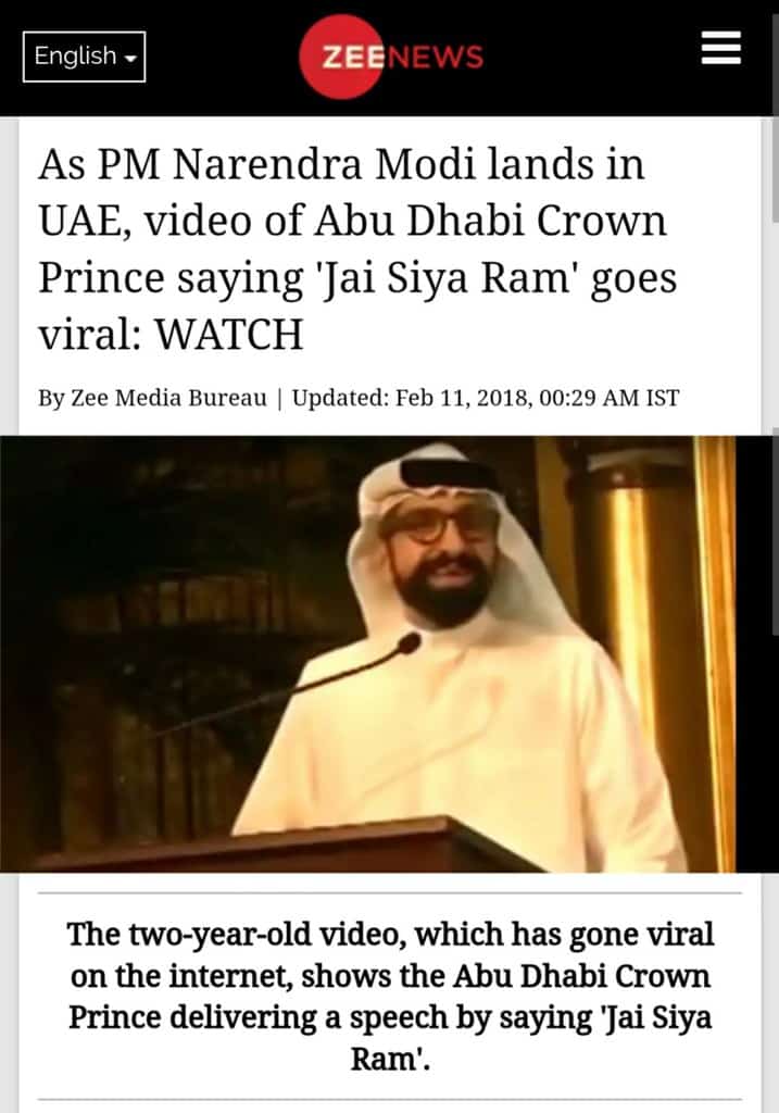 Alt News had earlier debunked another video from the same event where it was falsely claimed by leading news channels – Times Now and Zee News – that Abu Dhabi Crown Prince Sheikh Mohammed bin Zayed Al Nahyan inaugurated the Ram Katha of Morari Bapu in Abu Dhabi. Later, it was found that the person is a United Arab Emirates-based columnist and commentator on Arab affairs named Sultan Sooud Al Qassemi and NOT the Crown Prince Sheikh Mohammed bin Zayed Al Nahyan.