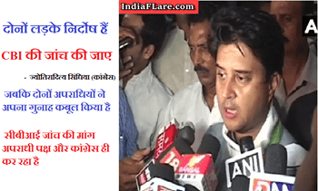 The article further claims that Congress leaders have spoken out in defence of the accused. The website has also published an article which claims that Congress leader from MP Jyotiraditya Scindia has said the two accused in the case are innocent and that a CBI inquiry be conducted. This too is false.