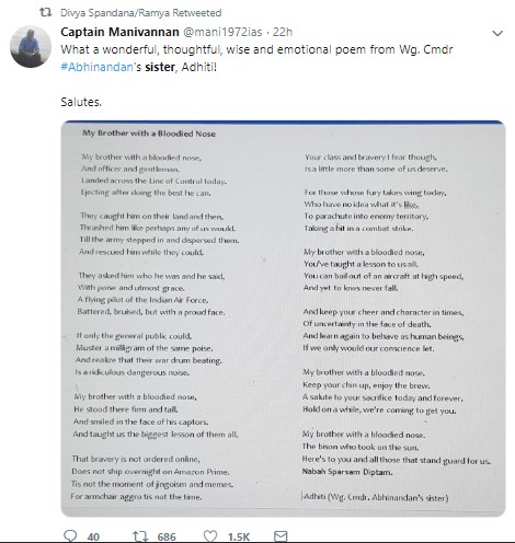 A poem attributed to the sister of wing commander Abhinandan Varthaman, who was captured by the Pakistani army on February 27, is floating across social media platforms. Among those who tweeted it was IAS officer Captain Manivannan. His tweet received over 1,500 likes and among those who retweeted it was Congress IT cell head Divya Spandana.