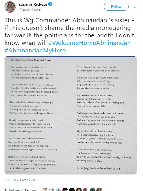 Heartwarming verse turned out by sister of #WingCommandarAbhinandan , saluting his bravery and dignity, and assailing jingoists and chest-thumping warmongers. Courtesy @VishnuNDTV @ndtv