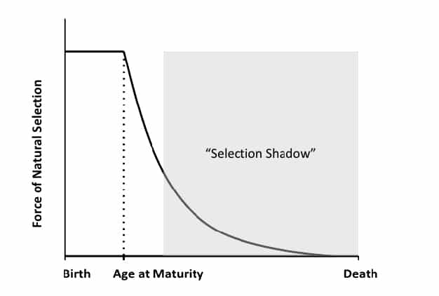 The selection shadow is the diminished force of selection with age and reproductive decline. Source: Fabian and Flatt, 2011