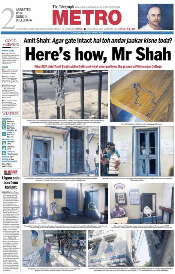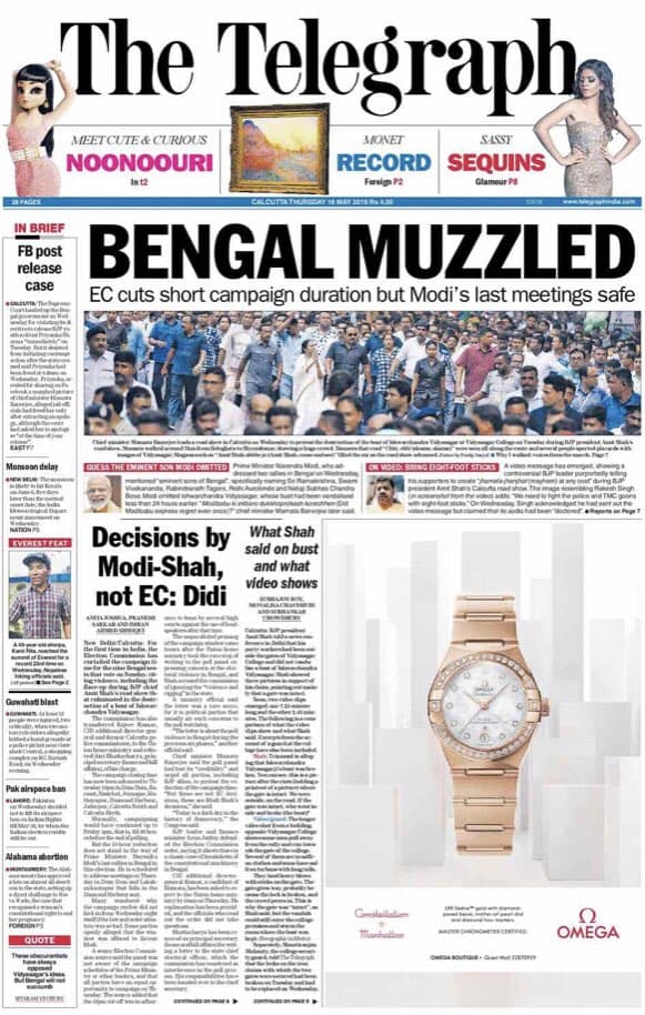 On May 16, The Telegraph‘s front page headline read “Bengal muzzled — EC cuts short campaign duration but Modi’s last meetings safe”. The Election Commission on Wednesday had invoked Article 324 to curtail the campaigning in nine West Bengal constituencies a day before its scheduled deadline. The development came in the wake of violence between BJP and Trinamool Congress workers in Kolkata.